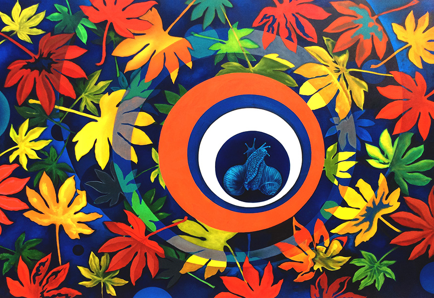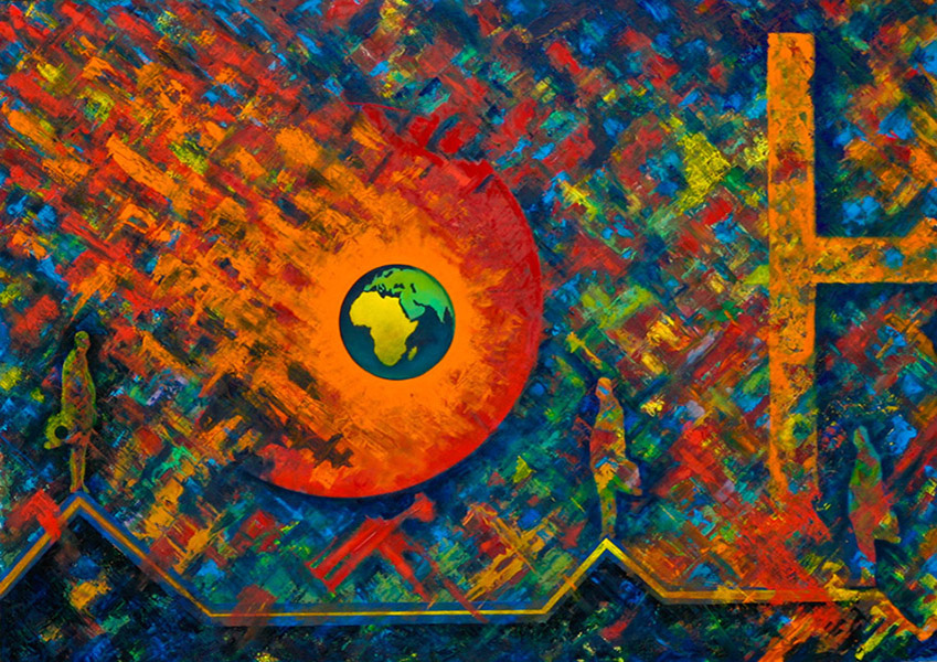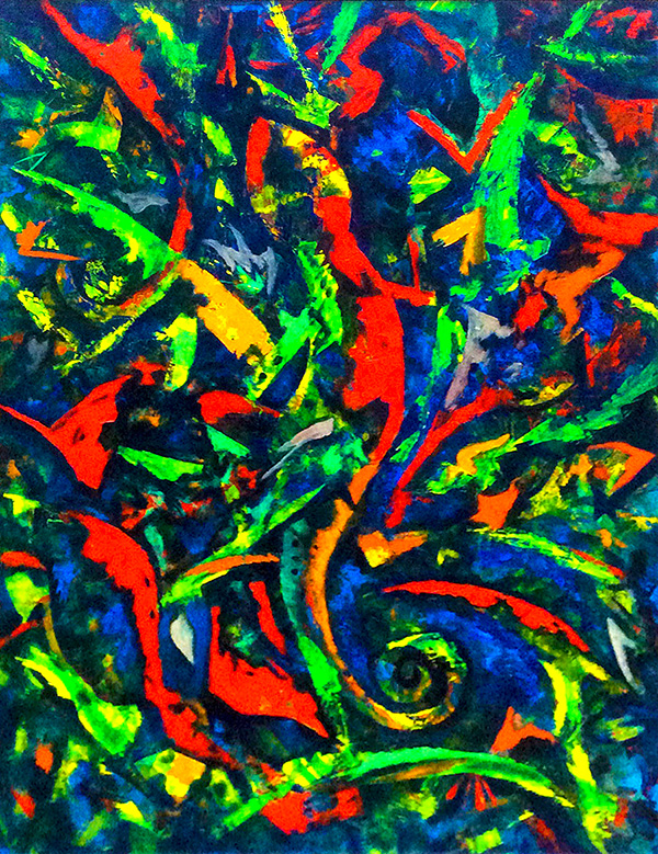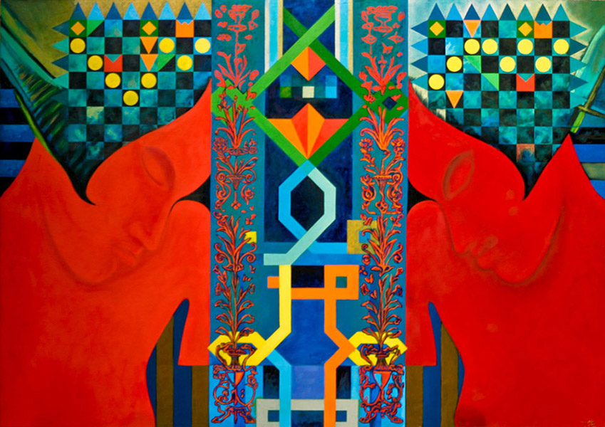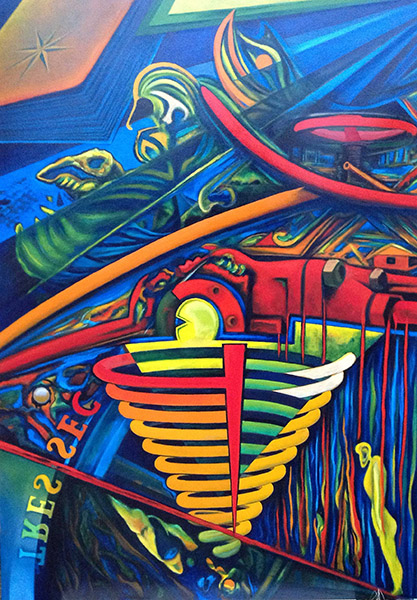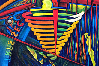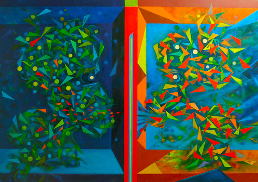 Mittels einer 3D-Brille (ChromaDepth Verfahren) verwandelt sich das Bild in einen dreidimensionalen Raum, welcher physikalischen Gesetzmäßigkeiten unterliegt.
