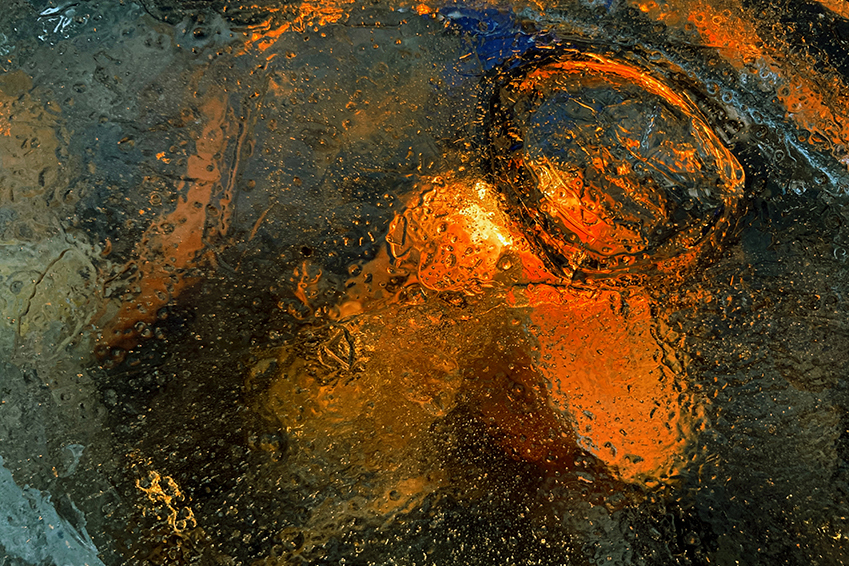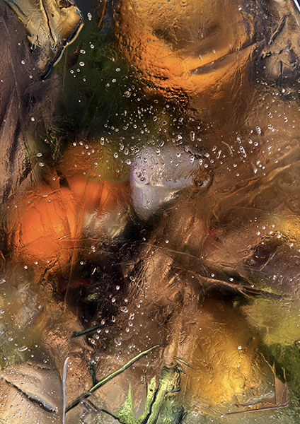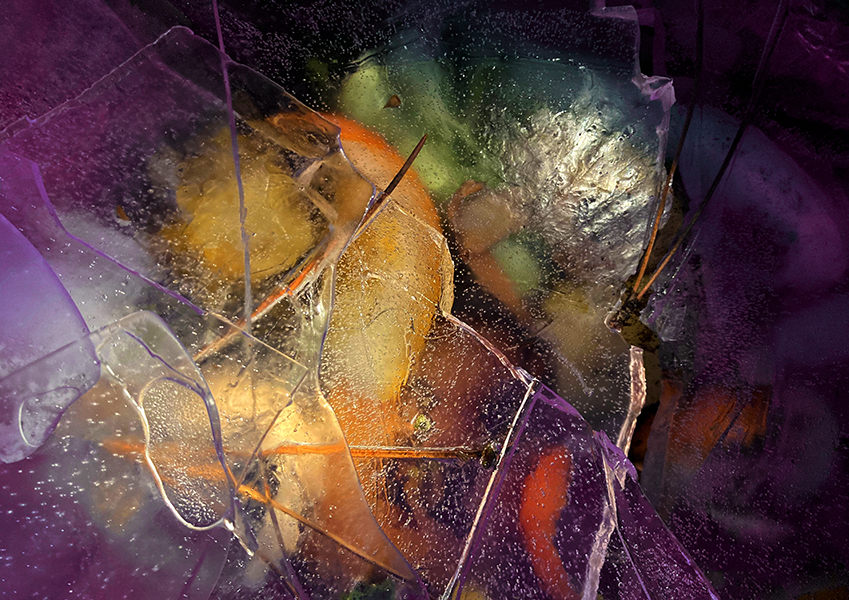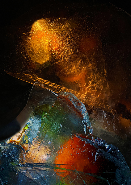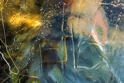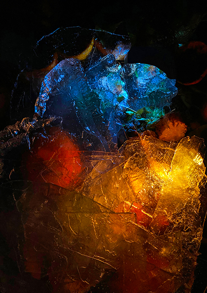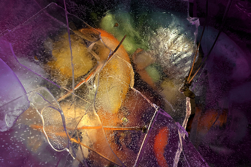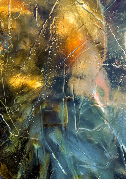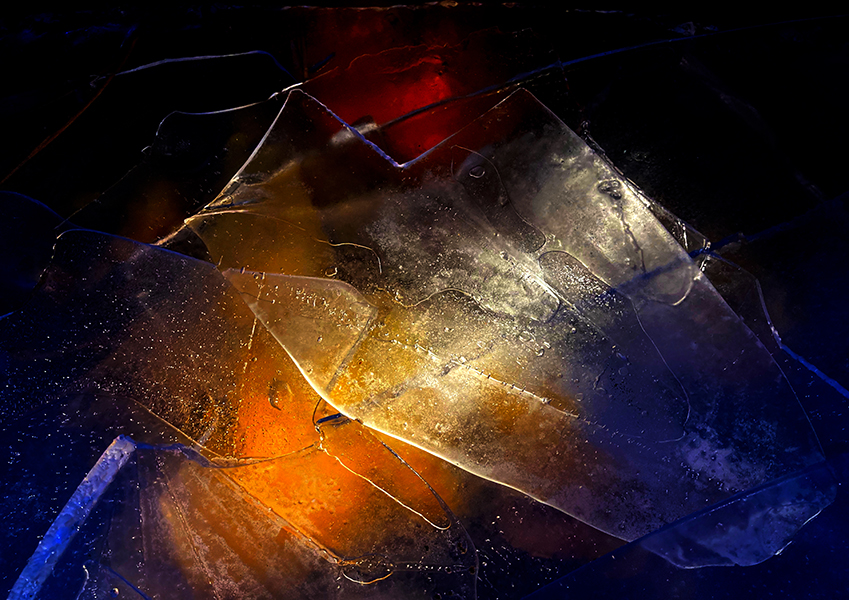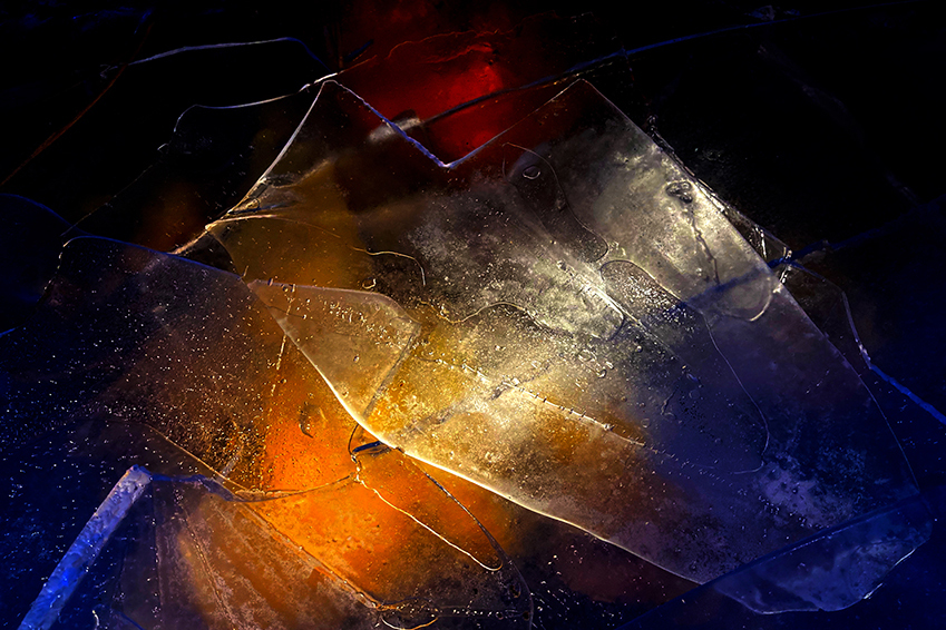 Unter dem Arbeitstitel „behind the bright side of the ice“ verbirgt sich eine jährlich im Winter wiederholende fotografische Serie welche sich mit Vergänglichkeit in Abhängigkeit von Licht (Natürliches &-oder Künstliches) und Temperatur beschäftigt. Mittels natürlichem Eis aus zBsp. Regentonnen oder ähnliches - in die Natur platziert begleite ich fotografisch den Augenblick als stoffliche Veränderungen. Im Ergebnis verschmelzen die tlw. Fraktalen Strukturen des Eises mit dem natürlichen Hintergrund zu einer Einheit mit z.T. bizarren Formen, unbekannten Welten und deren Farben wobei mir besonders der malerische Moment von Interesse ist.